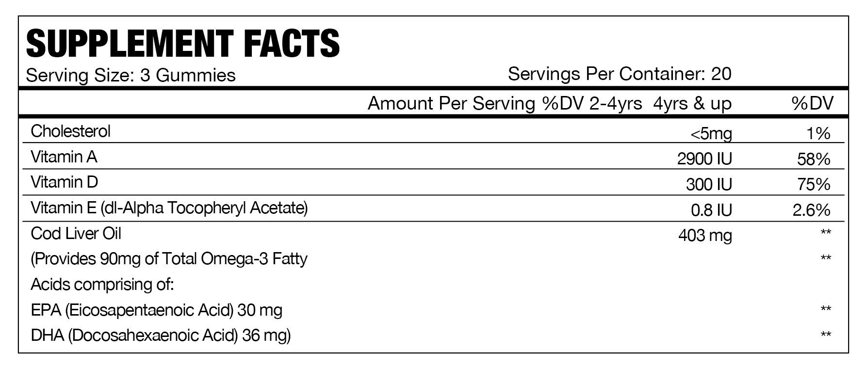 • Vitamin D (as Cholecalciferol) – 5 mcg (200 IU)
