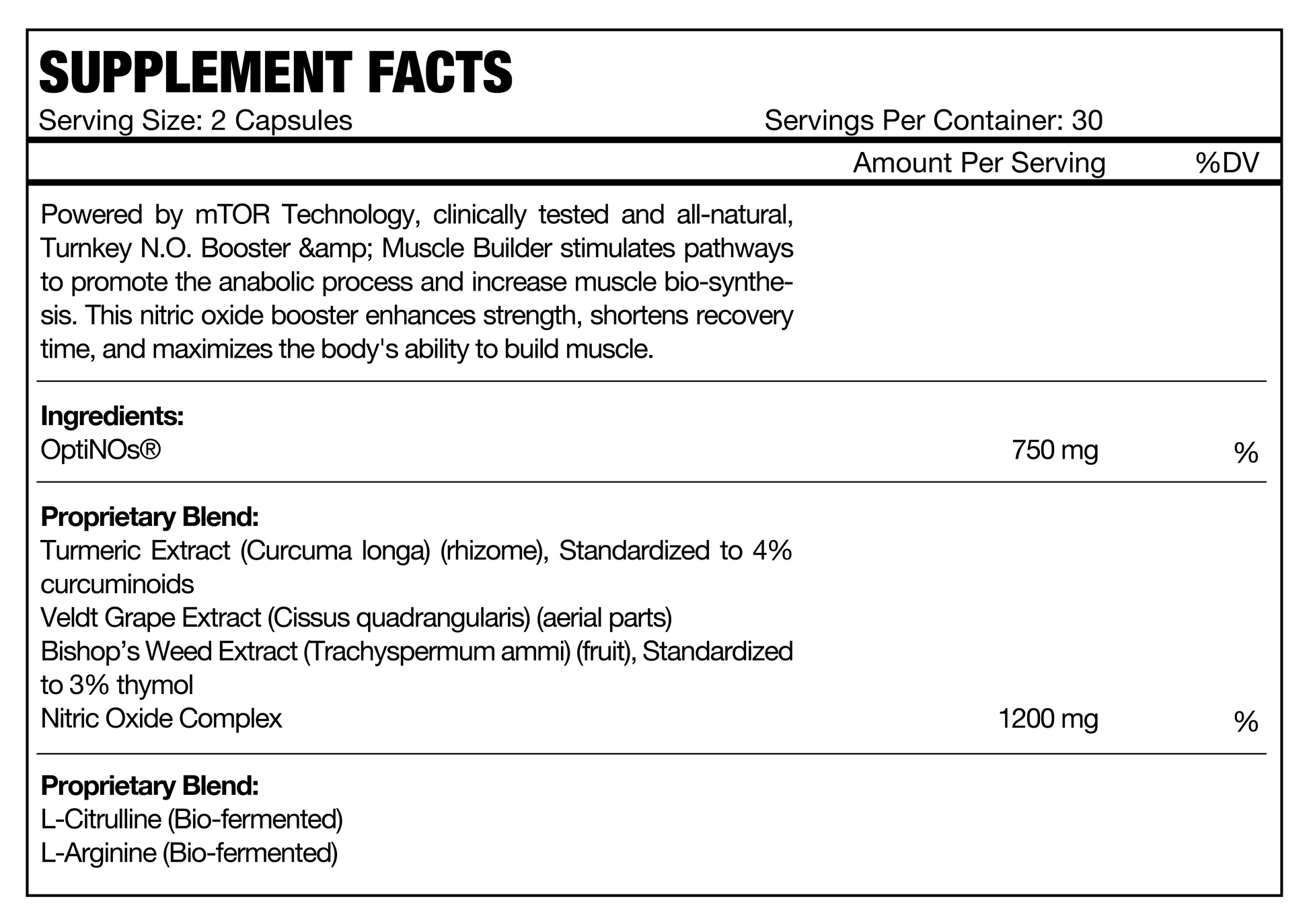 Powered by mTOR Technology, clinically tested and all-natural, Turnkey N.O. Booster & Muscle Builder stimulates pathways to promote the anabolic process and increase muscle bio-synthesis. This nitric oxide booster enhances strength, shortens recovery time, and maximizes the body's ability to build muscle.
